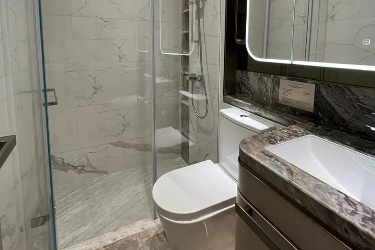 沐浴单元配备企业水箱,灰色和白色大理石铺设,时尚高贵。