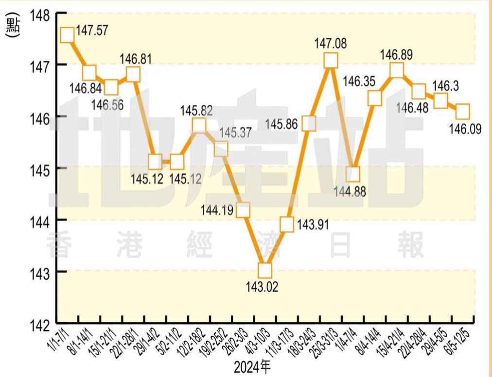 据香港城市领先房价指数资料,最新报144点,按周跌1.4%,创9周新低,并连跌4周。二手楼价受到新盘连环开售影响,持续受压偏软,撤辣后房价指数累计升幅收窄至约0.7%,预料除非有重大利好消息出现,才有明显突破。